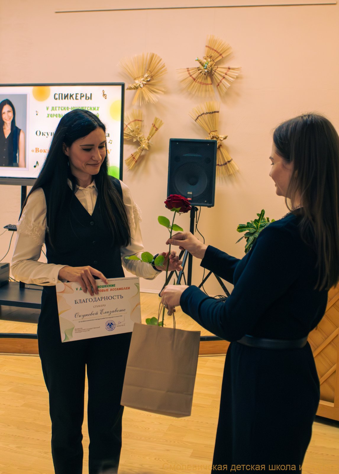 и многих других. Публика услышала как хоровые шедевры а капелла, так и произведения в сопровождении фортепиано. За роялем был наш блестящий концертмейстер — Дмитрий Геннадьевич Окунев, чье мастерство и чуткое сопровождение стали неотъемлемой частью успеха выступления. Но и это еще не всё! Наша руководитель хора, Елизавета Дмитриевна Окунева, провела для коллег и гостей ассамблеи мастер-класс на тему «Использование современных вокальных техник и методов на уроках академического хора». Ее профессиональный опыт и новаторский подход вызвали живой интерес и получили высокую оценку от музыкального сообщества.